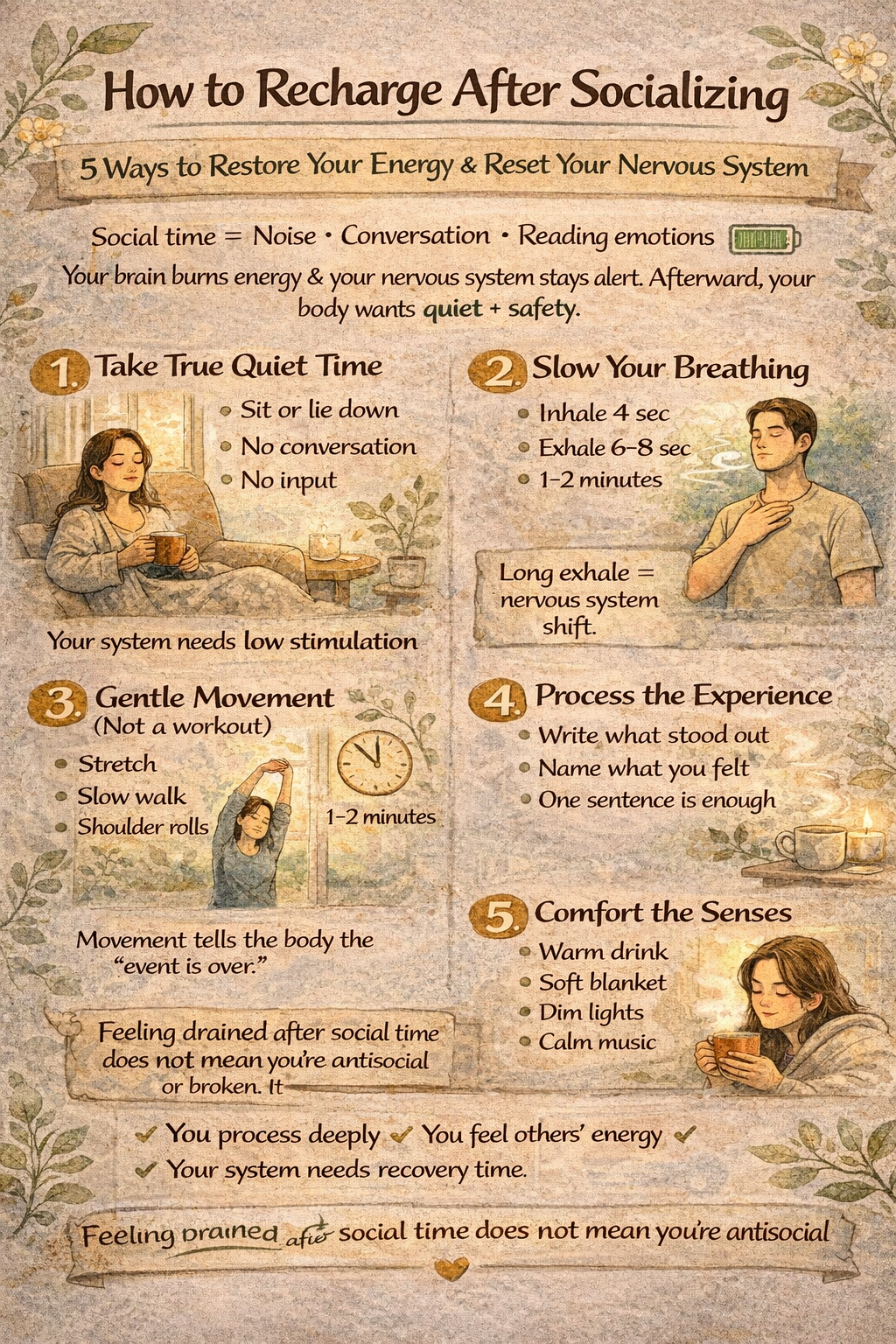 Feeling drained after social time does not mean you did something wrong. It means your nervous system worked hard. With preparation, boundaries, and recovery rituals, social experiences can feel more balanced and less depleting.
